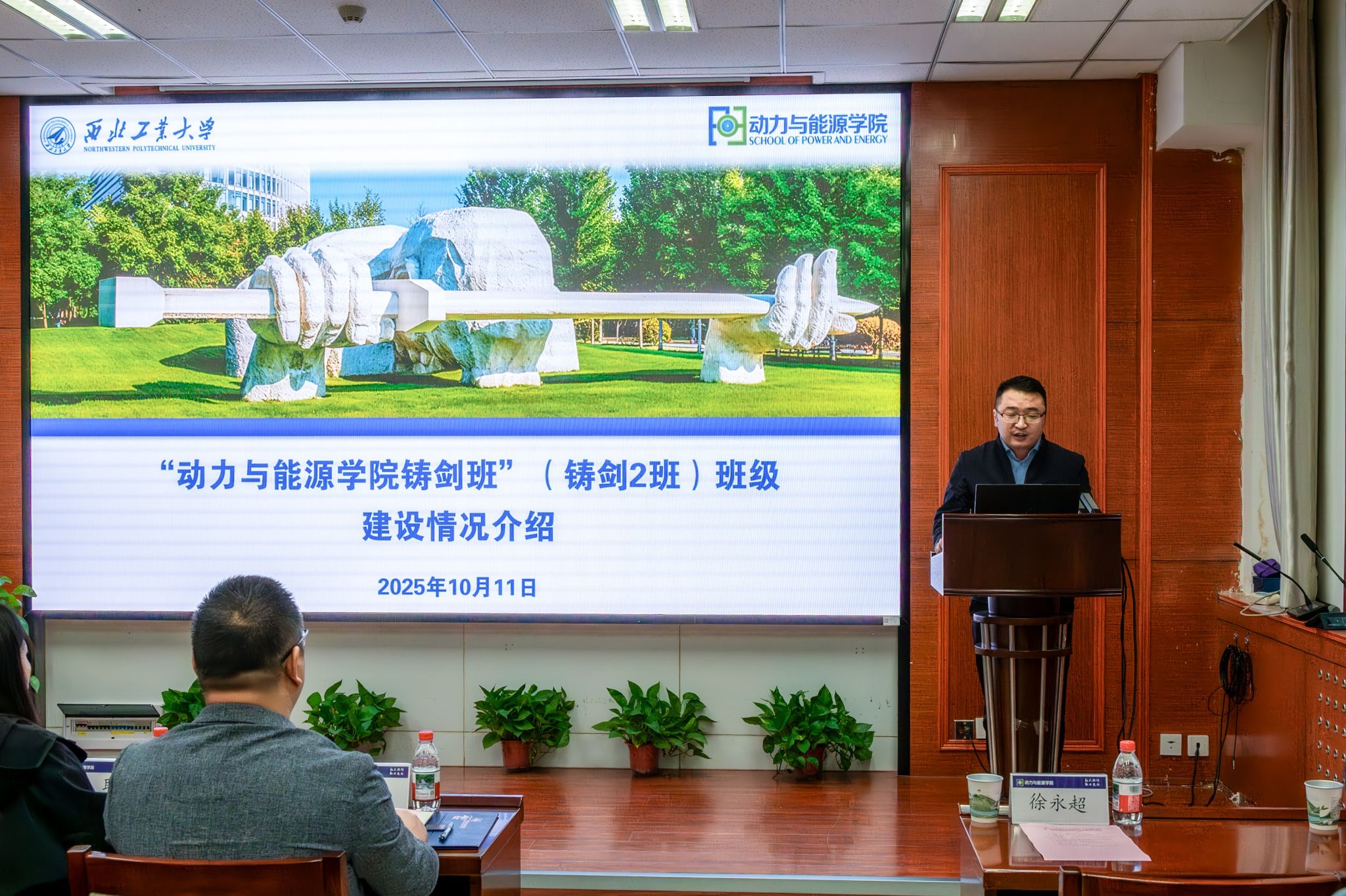 仪式伊始,徐永超副书记系统地介绍了铸剑2班的设立背景、育人理念与培养目标。他讲到,铸剑2班是学院为培养航空发动机领域优秀学子而精心打造的重要平台,旨在通过系统化、特色化的培养体系,引导学生铸魂育人、砺剑成才。他首先对照“塑魂、强基、益智、健体、拓维”的五维目标,回顾了第一期铸剑班的培养成果:学员们通过40余次精彩活动、人均170学时的学习以及总行程超3万公里的访学,留下了扎实的铸剑足迹。最后,他介绍了班级下一步的培养计划。
