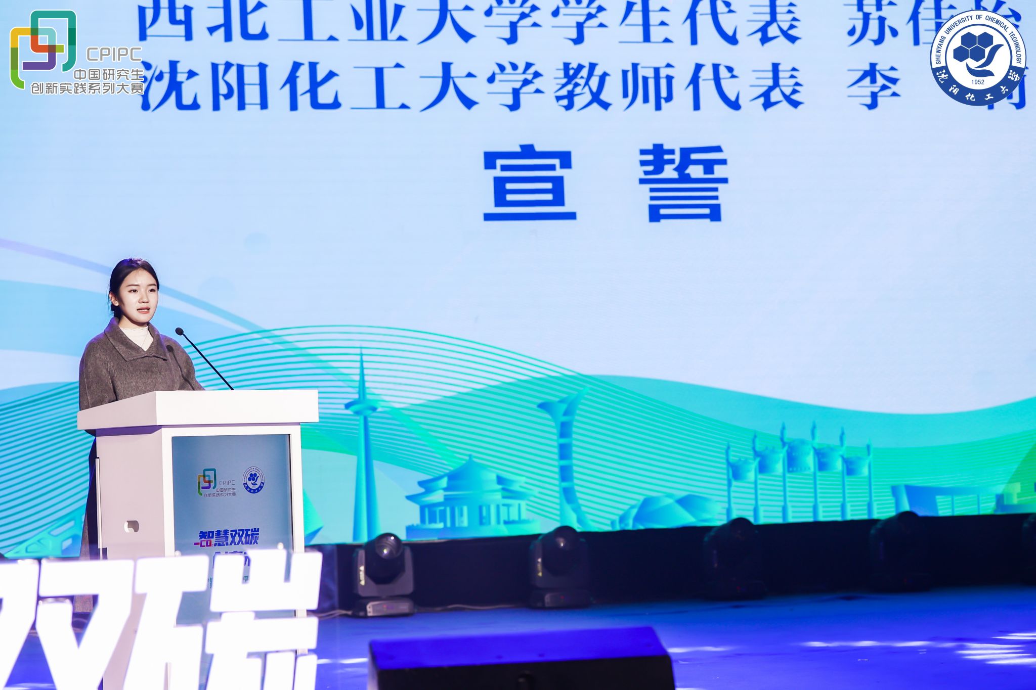 在开幕式上,我院2025级硕士研究生苏佳怡作为唯一参赛学生代表,面向全体评委和师生庄严宣誓,承诺以严谨态度展现创新成果,以奋斗精神践行双碳使命,展现了我校学子坚守诚信、追求卓越的精神风貌与服务国家战略的坚定信念。