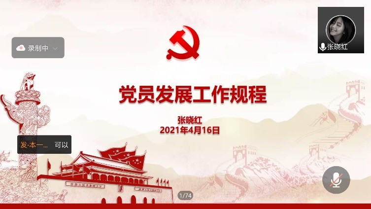 2021年4月16日,我院组织春季学期新发展的入党积极分子和发展对象共计200余人,一起线上聆听了校团委张晓红老师一次生动的党课。张晓红老师主要从党员发展基本程序和后期党员材料填写的注意事项这两方面给同学们带来了详尽的讲解。