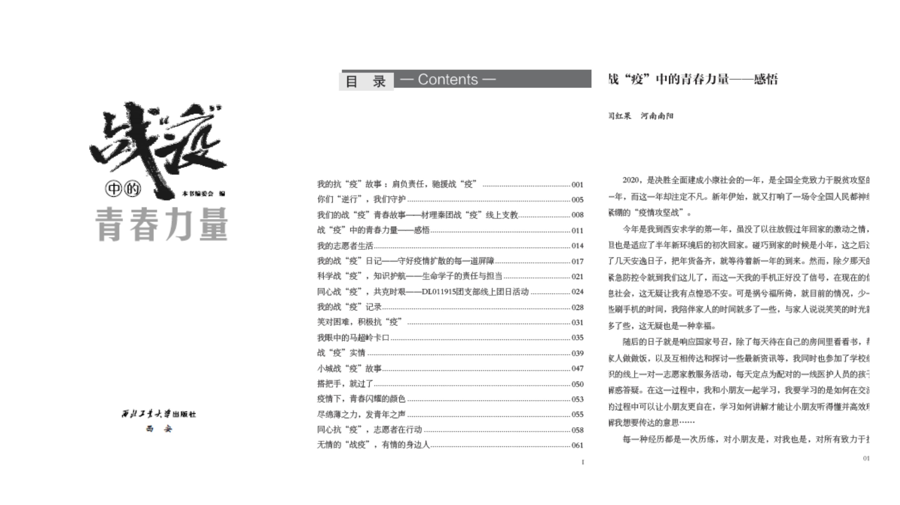 首先很荣幸能够成为由动能学院举办的第五届工大印记的获奖者,作为19级硕士研究生,能够在工大留下自己的印记是一件很值得让人高兴的事情。今年初期由于新冠肺炎的突然爆发,我深感不安,借着学校发起的“战疫中的青春力量”的倡议征稿活动,最终我有幸能够成为其中被收录的作者之一,于是就决定把它作为我的工大印记,以此来铭记2020年的不凡和我初次与工大共奋斗的历程。借此机会我也希望工大学子们能够继往开来,工大能够越来越好,让我们一起为国家和社会继续贡献出属于我们的青春力量!