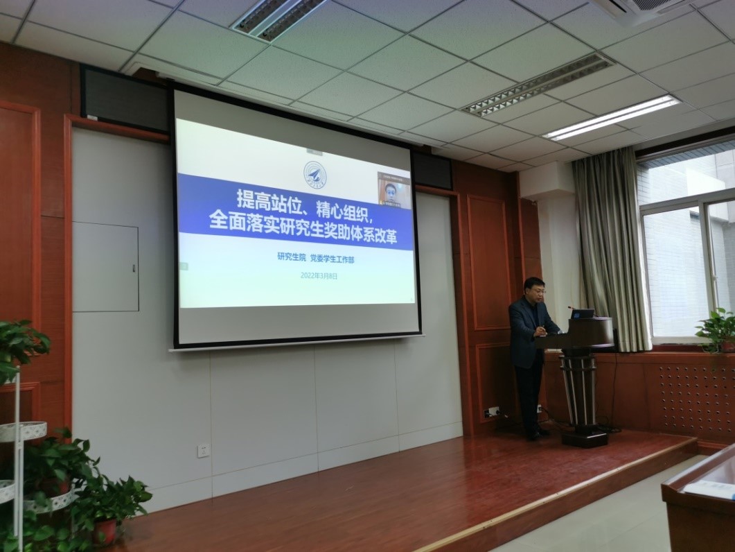 于2022年3月9日召开全院教职工大会,做“提高站位、精心组织,全面落实研究生将助体系改革”宣讲会。会议线上、线下同步进行,由学院党委书记闫育周主持。