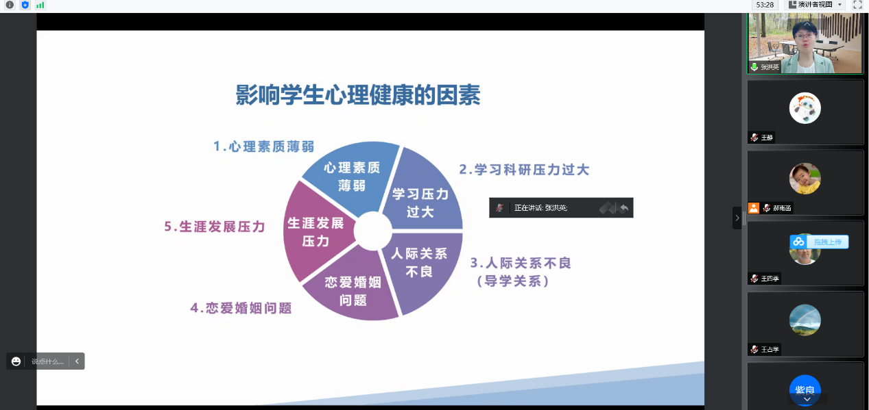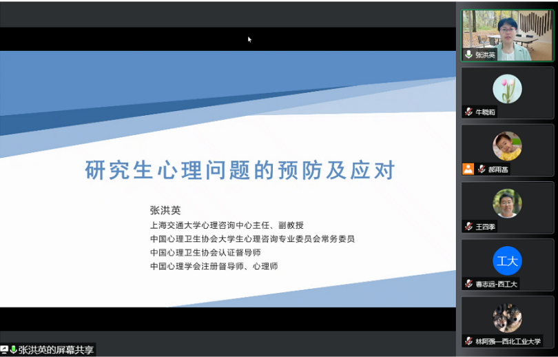授课过程中,张洪英副教授从我国第一部“心理健康蓝皮书”——《中国国民心理健康发展报告》切入,分析了研究生的普遍心理状态,并针对研究生的具体表现情况,剖析了学生心理健康的影响因素,提出一些心理问题的判断方法和有效的应对策略;随后从心理学小实验入手,说明了学生应激反应的表现方式以及应激条件下学生防御发生机制,并提出给予学生获得感和成就感等相关心理引导的方法,逐步引导学生重新建立自信;最后,从导学关系的角度,说明了在培养学生心理健康过程中沟通的重要性。