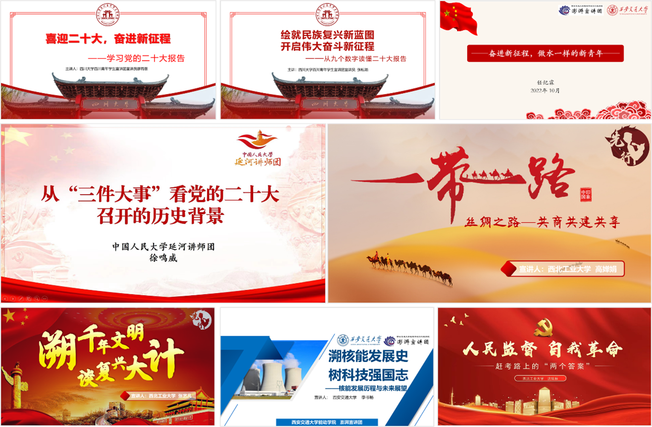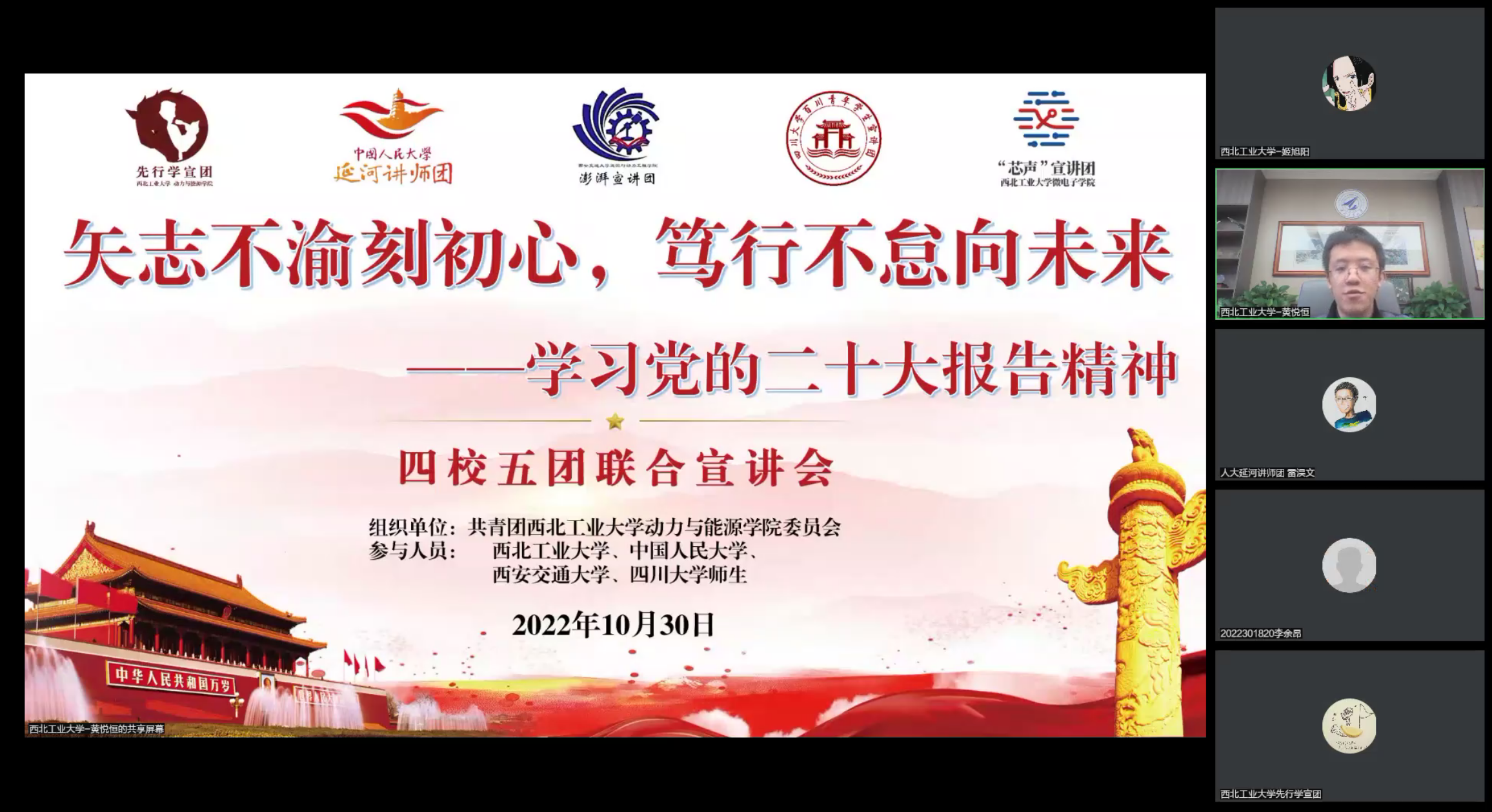 先行学宣团,分别邀请中国人民大学“延河讲师团”、西安交通大学能源与动力工程学院澎湃宣讲团、四川大学百川青年学生宣讲团、西北工业大学微电子学院“芯声”宣讲团,于10月30日共同举办主题为“矢志不渝刻初心,笃行不怠向未来——学习党的二十大精神”的理论学习宣讲会。宣讲效果良好,引发高校学子热议。