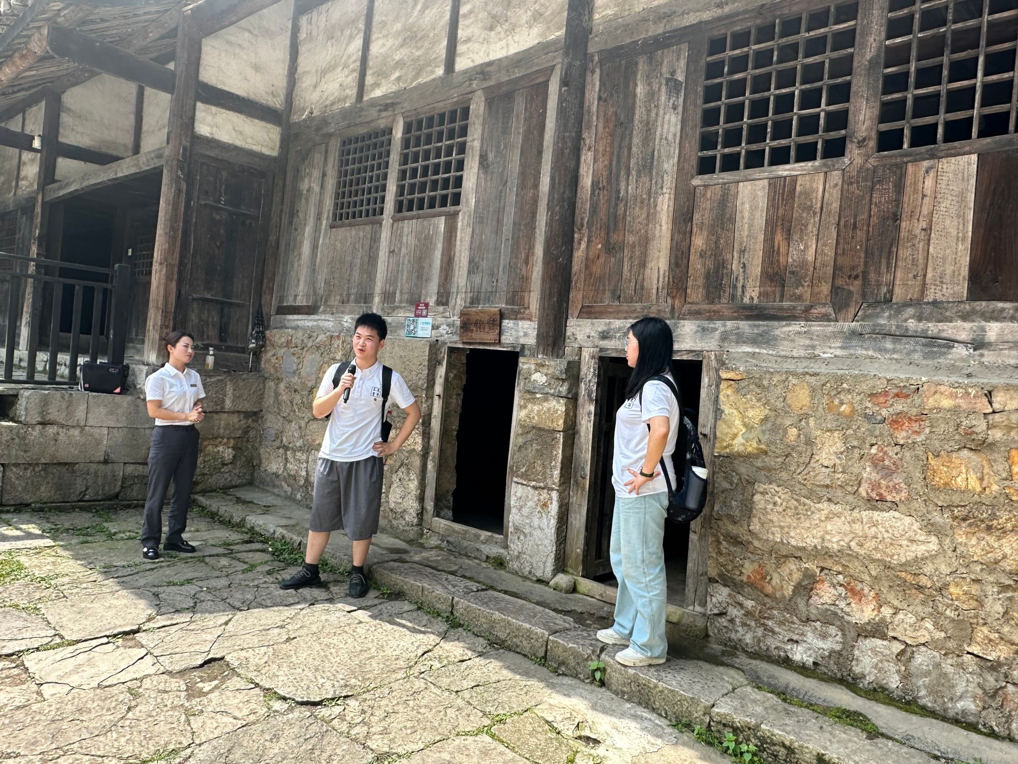 随后,实践队员前往息烽集中营旧址,参观当年关押与审问共产党员与爱国人士的建筑旧址。讲解员着重向实践队员们介绍了其中的“感化室”:“这里阴暗潮湿,原本为之前庄园地主喂养牲畜的地方,后被改造为监狱,关押人员进去之后只能在里面低头弯腰行走,仿佛在认错。室内高度仅为为一米四的‘感化室’曾经关押身高一米八的马寅初先生八个月之久。”有两名实践队员进入“感化室”,进行两分钟沉浸式体验被关押的感受,其余成员在“感化室”外同步体验。