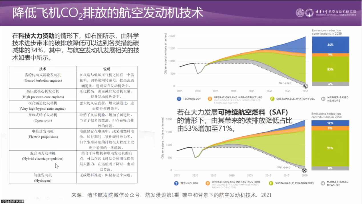 帅石金教授首先从宏观角度介绍了航空发动机减碳的机遇和挑战,接着从能源与动力两个层面分别详细介绍了航空发动机减碳不同的技术路线。能源层面重点介绍了可持续航空燃料(SAF)的优缺点以及氢能被应用于商业航空领域的方式,动力层面对涡电混合动力与全电动力两种不同方式进行了对比介绍。最后,帅石金教授与参会人员围绕航空发动机低碳化与电动化技术进行了热烈讨论。