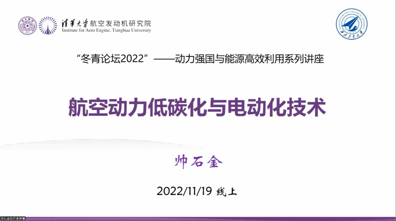 20221119日上午十点,应西北工业大学冬青学会郭恒杰教授邀请,清华大学航空发动机研究院党工组组长、副院长,清华大学壳牌清洁交通能源中心主任帅石金教授针对《航空发动机低碳化与电动化技术》进行了一场系统且详实的学术报告。多所著名高校及科研院所的专家、老师和研究生共计百余人次参与报告,论坛由动力与能源学院杜昆副教授主持。
