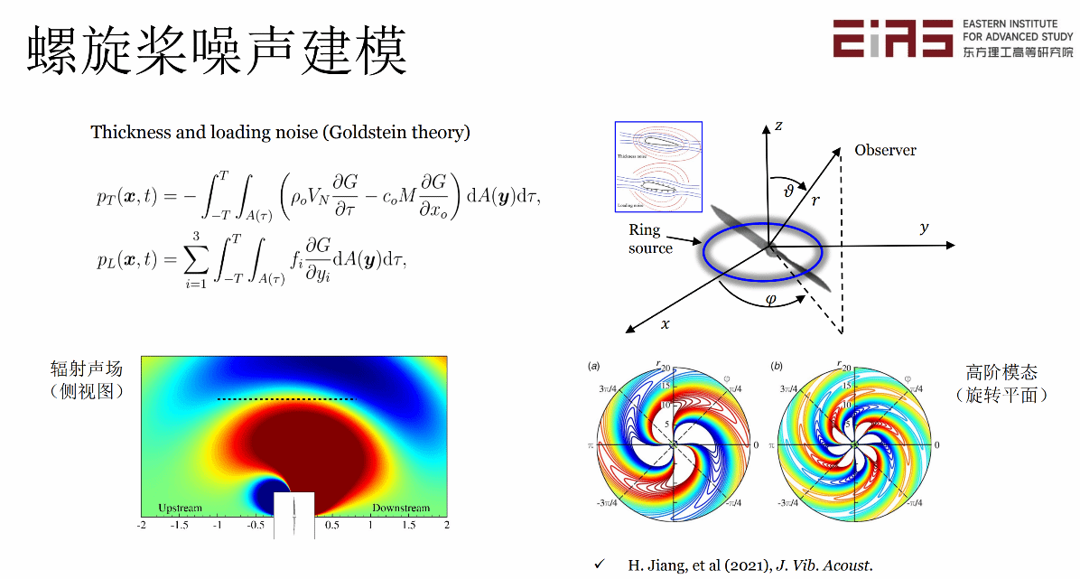 接下来,姜汉博副研究员结合理论分析和数值模拟的研究方法指出,扭矩对于螺旋桨单频噪声贡献最大,推力所产生的噪声主要向上、下游传播,在旋转平面内几乎没有贡献;悬停状态下,螺旋桨宽频噪声主要来自于叶片尾缘噪声,噪声源为表面压力时间导数且主要分布在螺旋桨叶尖附近。
